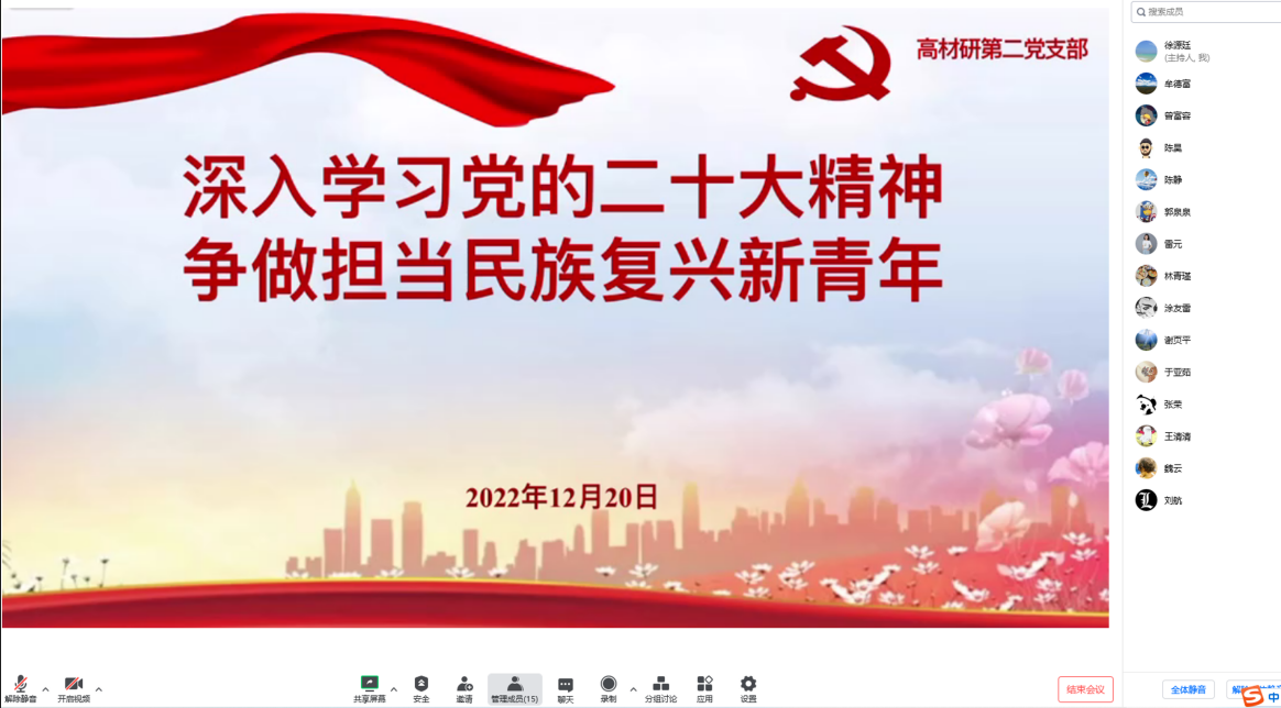 为全面学习落实党的二十大精神,进一步加强党支部的思想政治建设工作,提高党员思想觉悟,2022年12月11日,我院高材研究生第二党支部举行了二十大专题学习党组织生活。本次组织生活以线上学习的方式进行,由党支部书记徐源廷老师主持,MG电子 党委书记牟德富教授也参加了支部本次的组织生活。