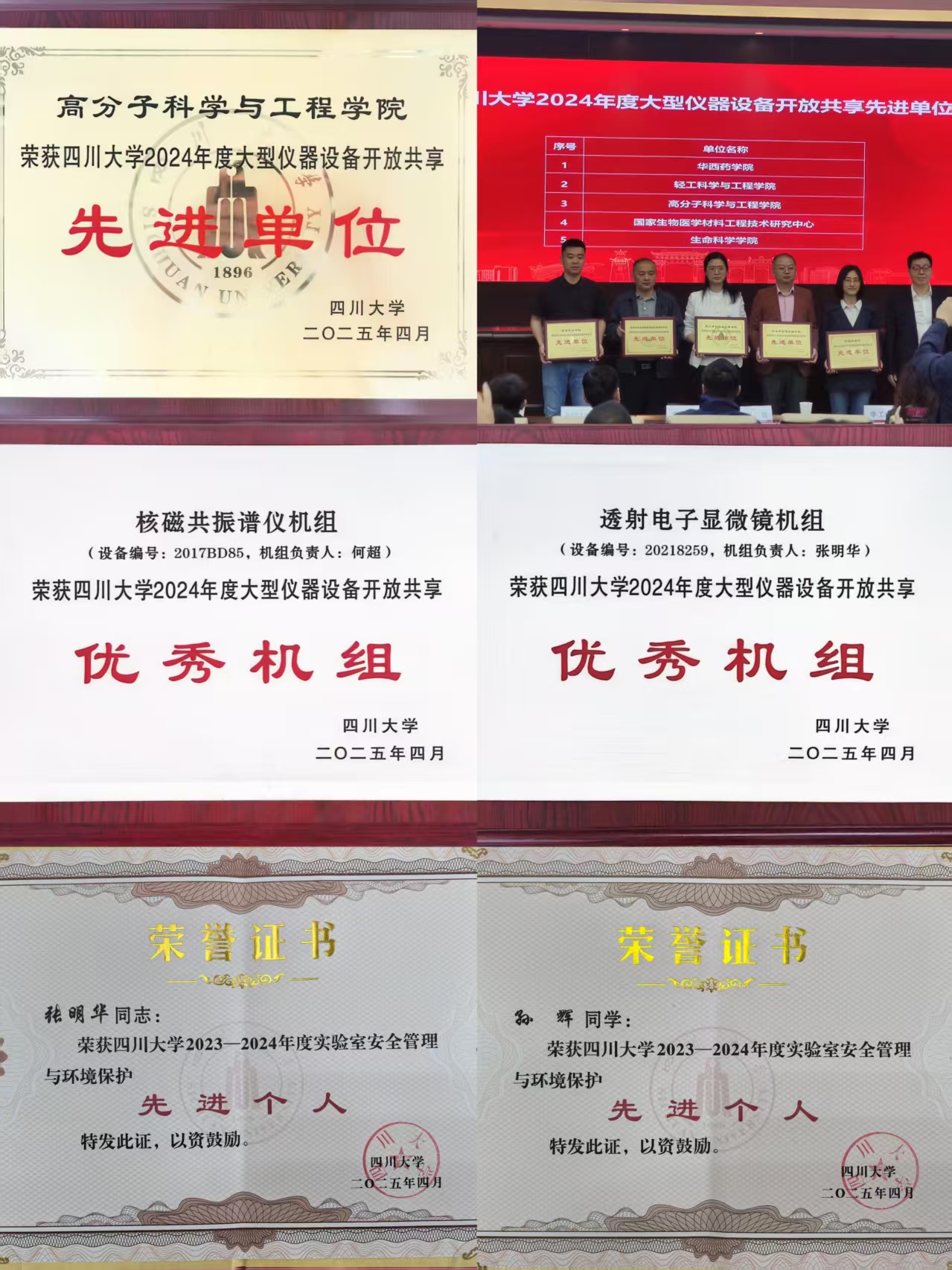 我院被授予“ 四川大学2024年度大型仪器设备开放共享先进单位 ”(排名第三),核磁共振谱仪机组、透射电子显微镜机组被授予“四川大学2024年度大型仪器设备开放共享优秀机组”,张明华老师和孙辉同学获得“四川大学2023-2024年度实验室安全管理与环境保护先进个人”的荣誉称号。