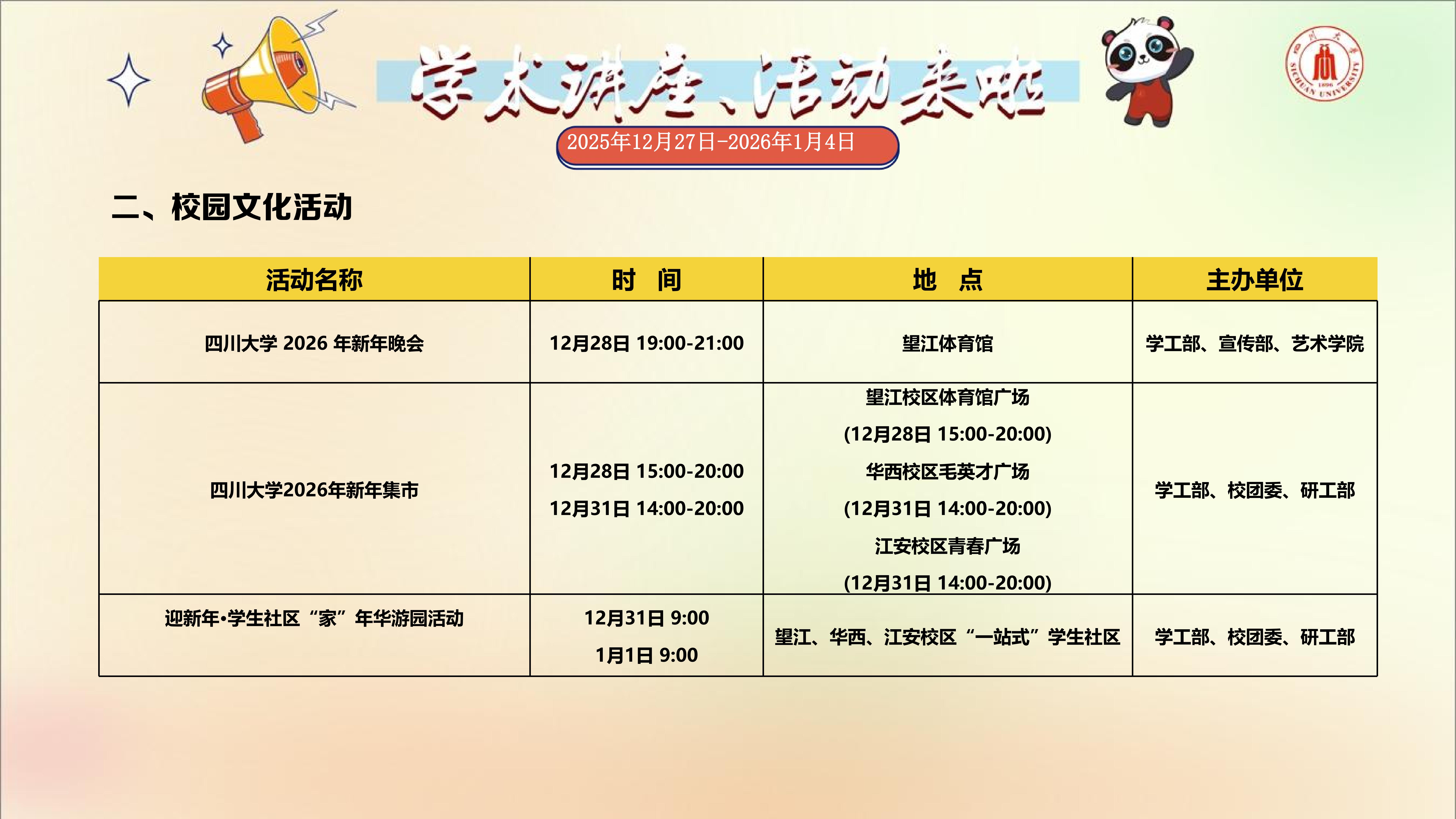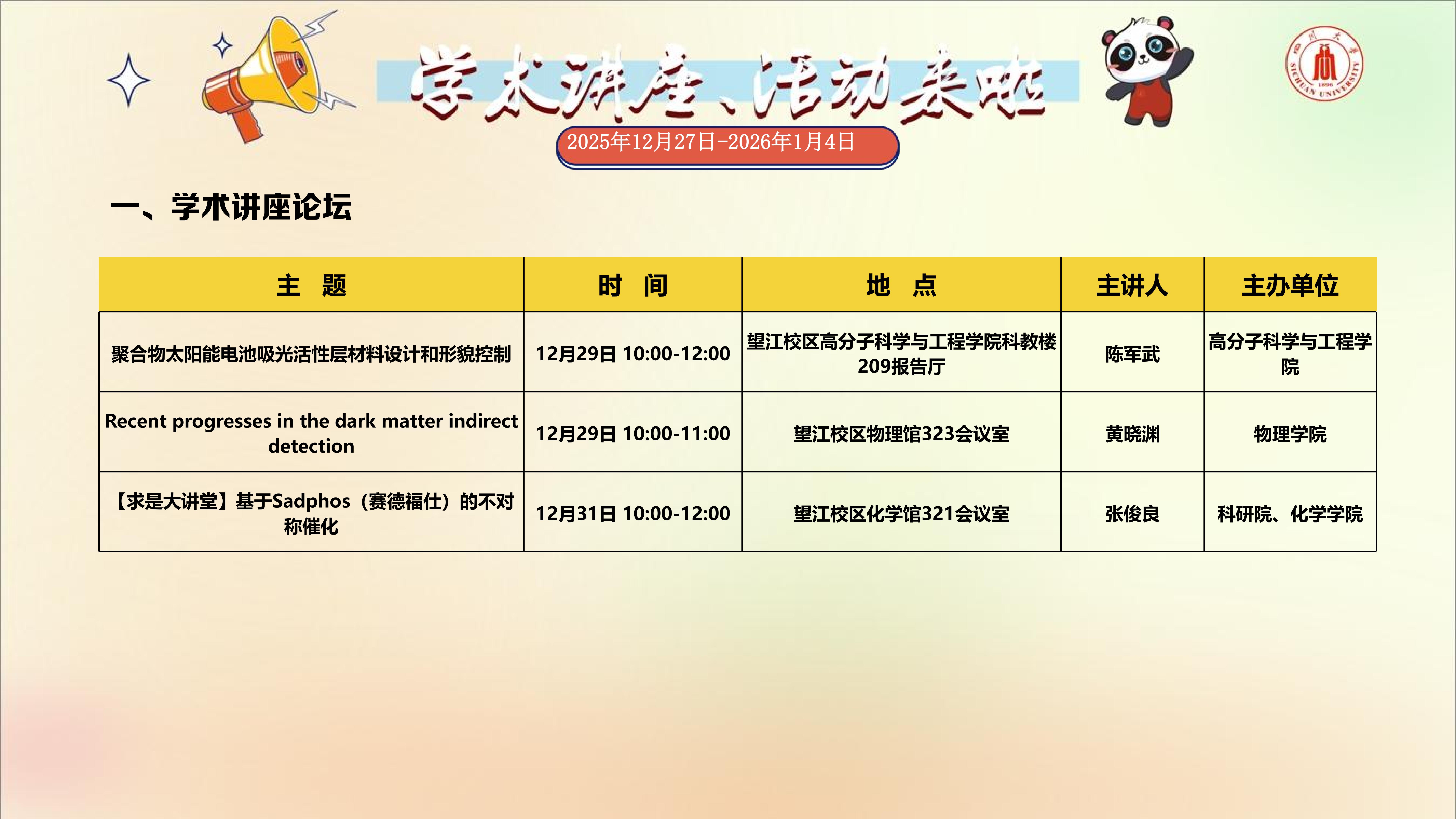 学术讲座和校园文化活动预告(2025年12月27日-2026年1月4日)